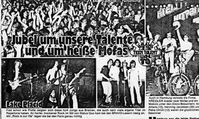 - ...nein, so weit entfernt war das alles gar nicht, genau genommen im Naturfreundehaus in der Buchtstraße in Bremen nahm alles seinen Anfang. Gonzo, Klose, Benno und Detlef hatten sich kurz vorher im Ruderverein 1882 in HB getroffen, "lieben-gelernt" und beschlossen, gemeinsam lyrischen Rock mit englischen Texten zu komponieren und zu zelebrieren. Der "gigantische" Bühnenaufbau sorgte beim ersten Konzert der Vier für Verzückung im Publikum :-).